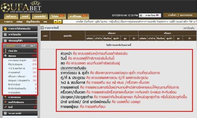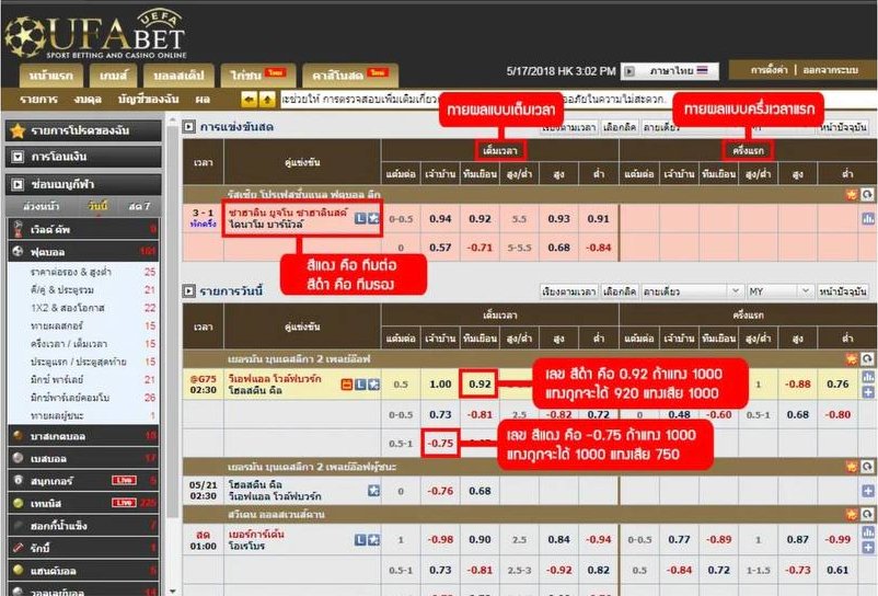 ในระบบของ UFA289 ผู้เล่นสามารถเลือกแทงบอลออนไลน์ได้ 2 รูปแบบหลัก ๆ คือ แทงแบบเต็มเวลา 90 นาที คือการทายผลการแข่งขันในช่วงเวลา 90 นาทีรวมช่วงทดเวลาบาดเจ็บ (ไม่รวมการต่อเวลาและยิงจุดโทษ) แทงแบบครึ่งเวลา 45 นาที คือการเดิมพันเฉพาะครึ่งแรกของการแข่งขัน รวมช่วงทดเวลาบาดเจ็บเช่นกัน ทีมสีแดง คือทีมที่เป็นต่อ ส่วนทีมสีดำ คือทีมที่เป็นรอง ค่าน้ำสีดำ 0.92 หากคุณแทง 1,000 บาท แล้วเดิมพันชนะ จะได้กำไร 920 บาท หากแพ้ จะเสียเต็ม 1,000 บาท ค่าน้ำสีแดง -0.75 หากคุณแทง 1,000 บาท แล้วเดิมพันชนะ จะได้กำไรเต็ม 1,000 บาท หากแพ้ จะเสียแค่ 750 บาท
